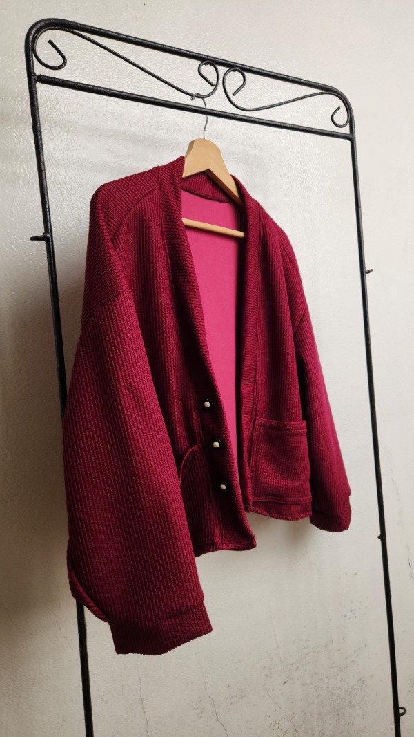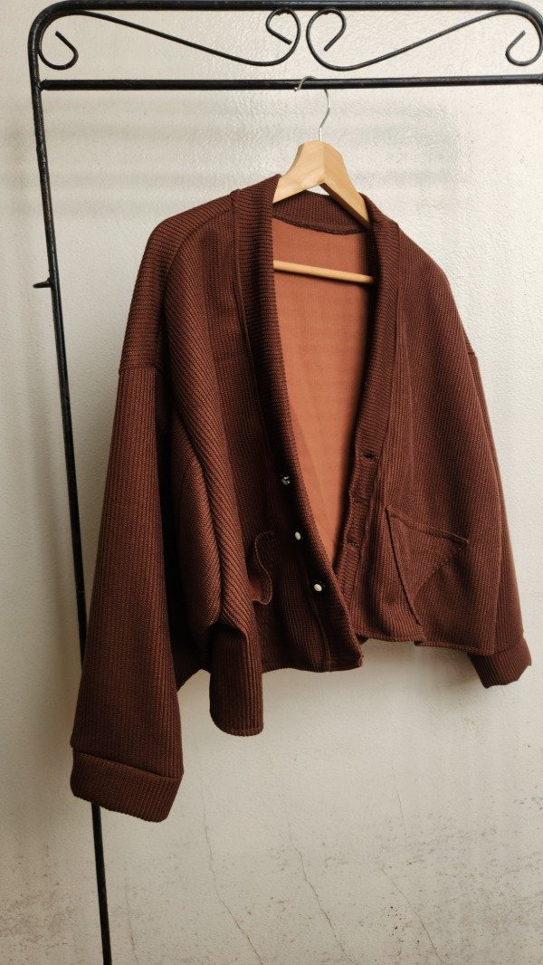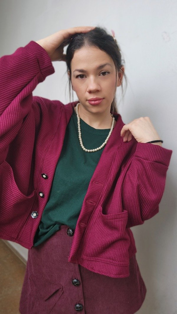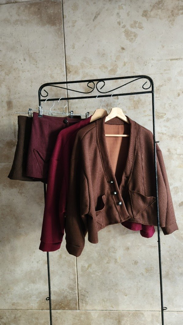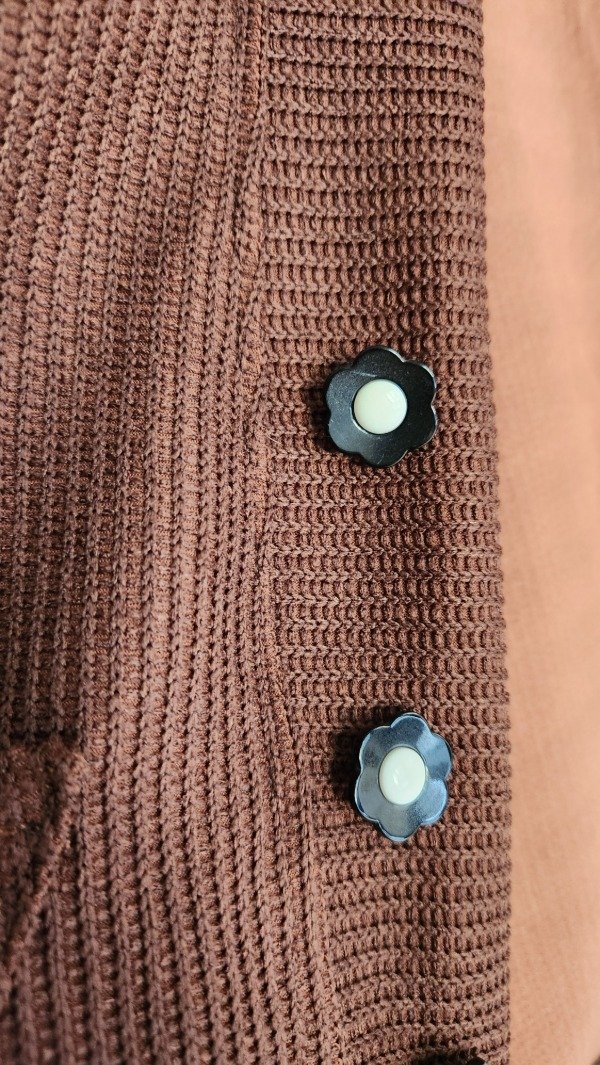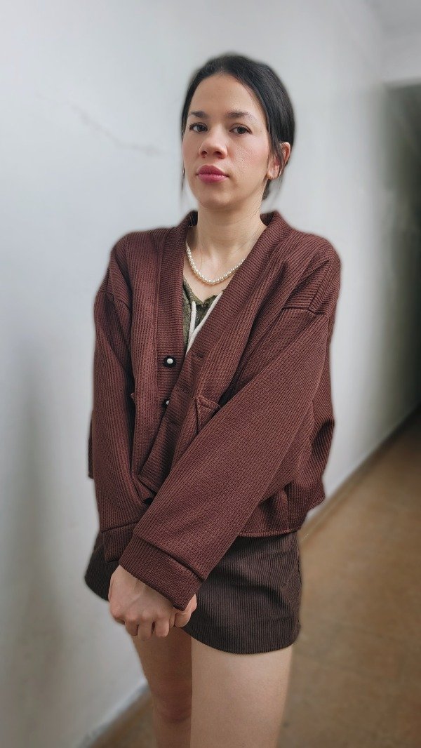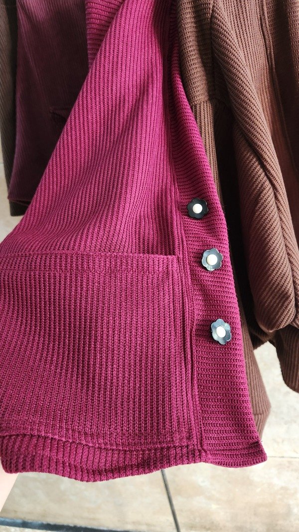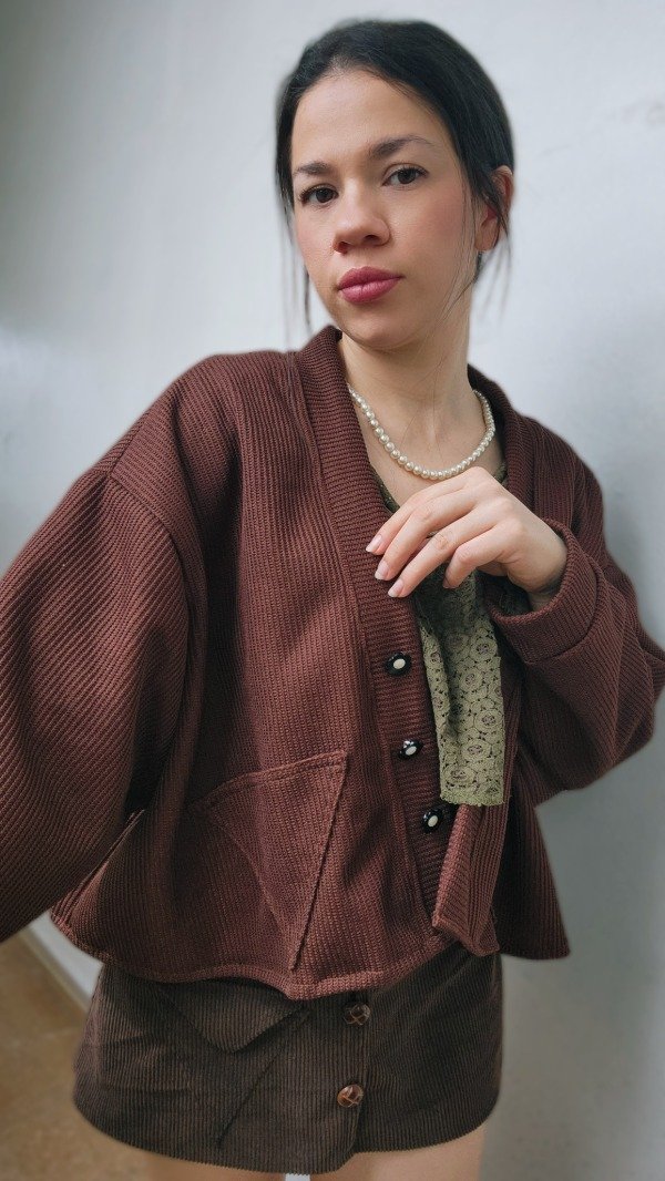 El toque especial lo dan sus cuatro botones artesanales, decorados con pequeñas flores en blanco y negro, que transforman un básico en una pieza de diseño única. Disponible en dos tonos profundos y sofisticados para esta temporada: Chocolate y Bordó."