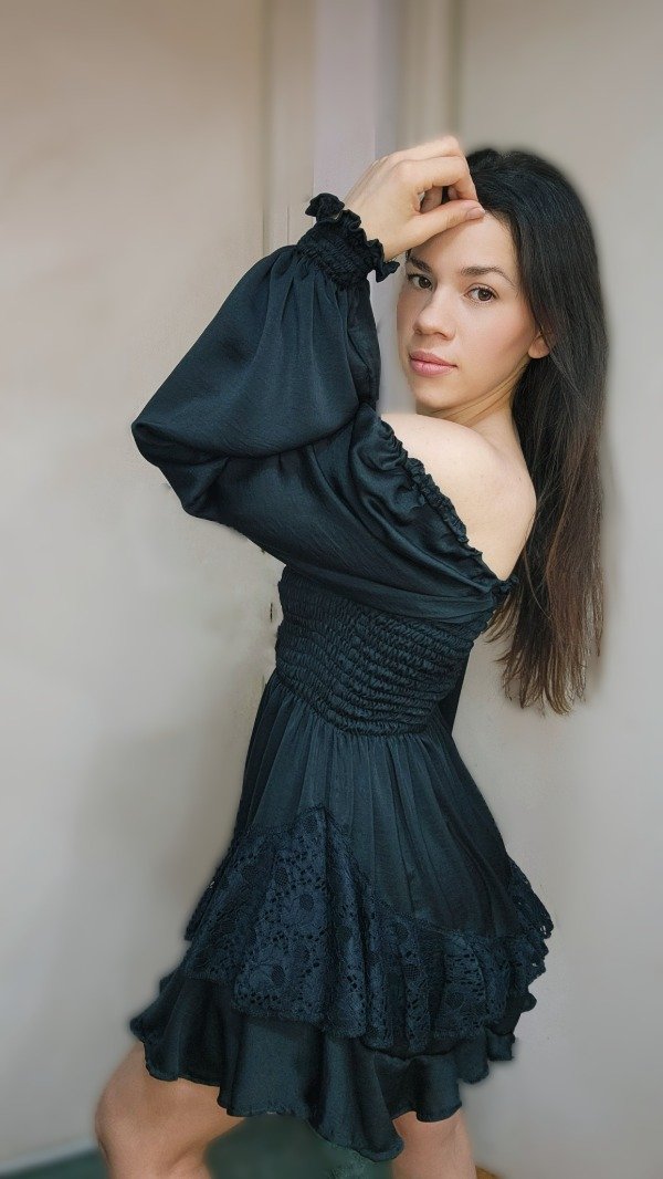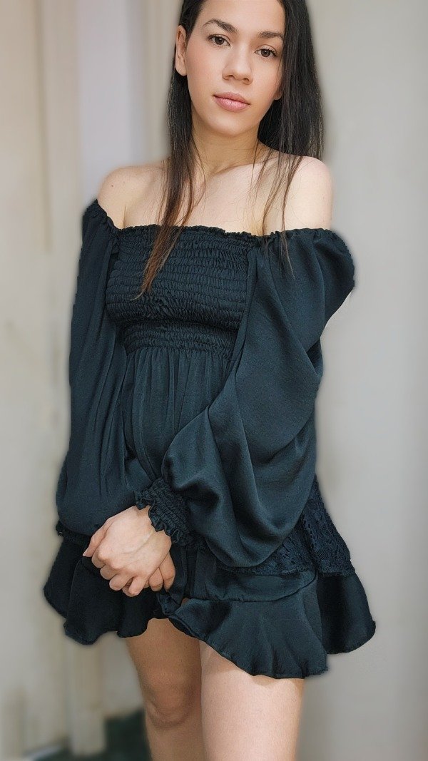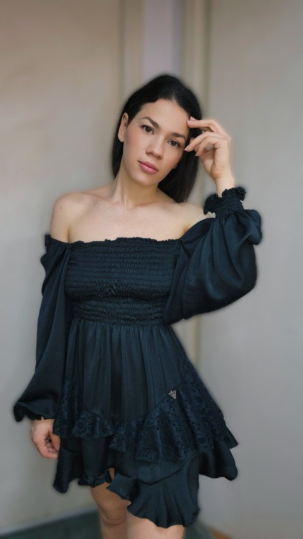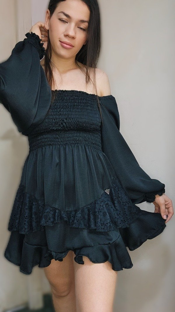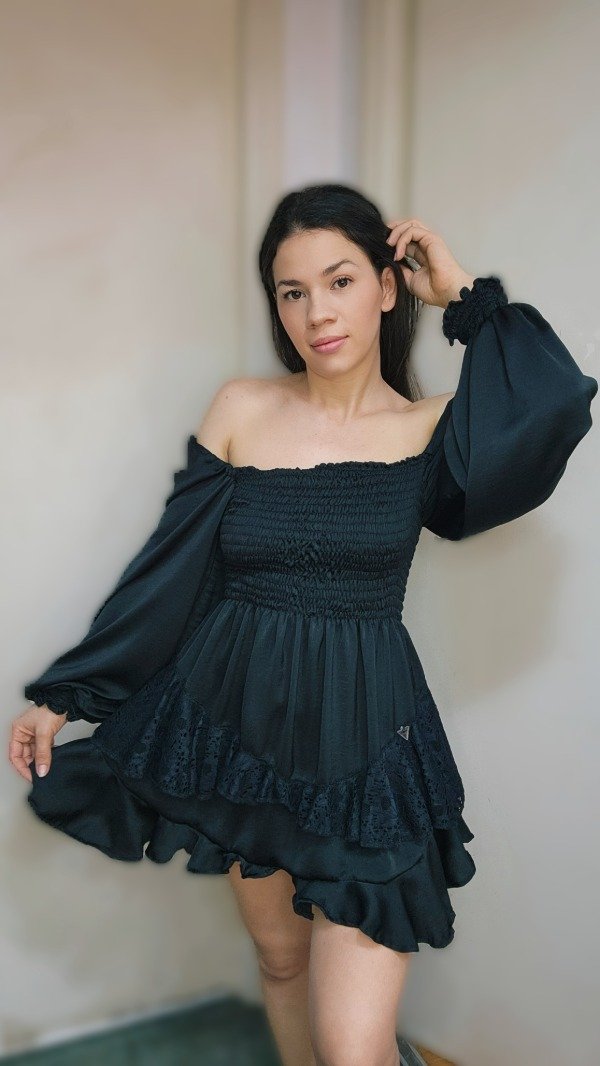 Descripción: Un diseño pensado para quienes buscan la distinción en los detalles. Este vestido corto en sedita negra destaca por su exquisito trabajo de drapeado en la zona del busto, que realza la silueta con una caída fluida y sofisticada. Las mangas largas terminan en puños definidos, aportando una estructura elegante y un aire vintage renovado. Una pieza atemporal, confeccionada con la delicadeza que solo la seda puede ofrecer.